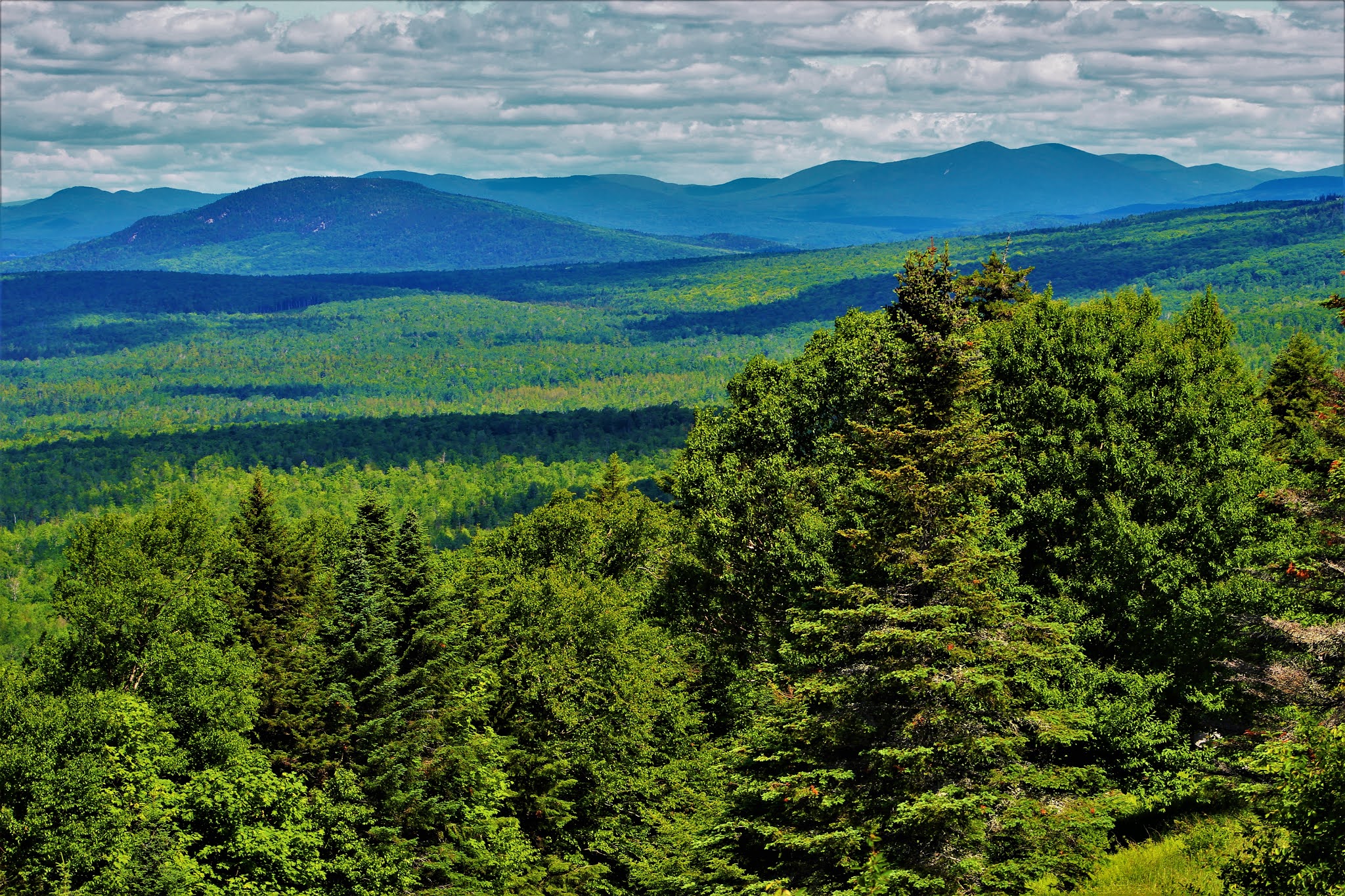 | West Kennebago Mountain, another multi-peaked mountain, seen past smaller hills to the north. |
