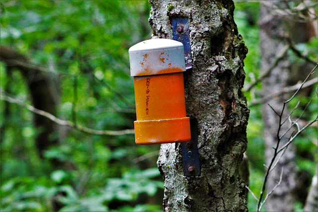 | Bolted to a spruce tree, the Eagle Mountain canister is well-worn, its orange coloring beginning to fade. |